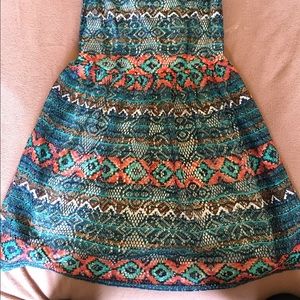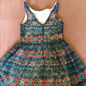 Excellent condition and very cute dress! Size XS. Teal, coral, brown and a little turquoise and orange in color.
