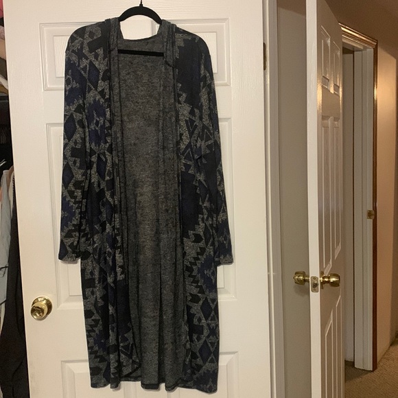 Black,blue and grey long length sweater with a hood. In good previously worn condition. Not sure on brand or size because the tag has been removed but was purchased at a Gordmans in the plus size section