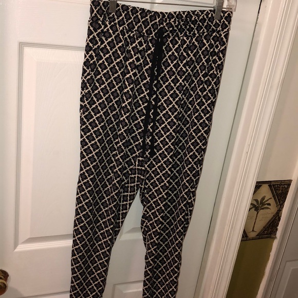 The combination of black, tan, and a light purple make these pants fun & easy to throw on. They have an elastic band that will stretch to fit your waist and also ties. They have a skinny ankle fit.