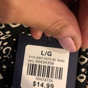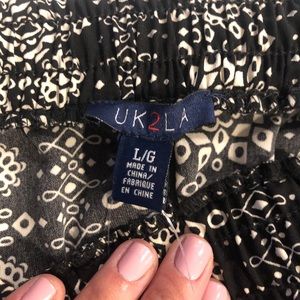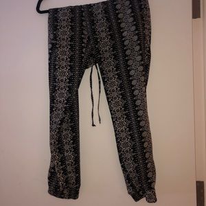 Patterned black and cream pants with drawstring and cinched at ankles.