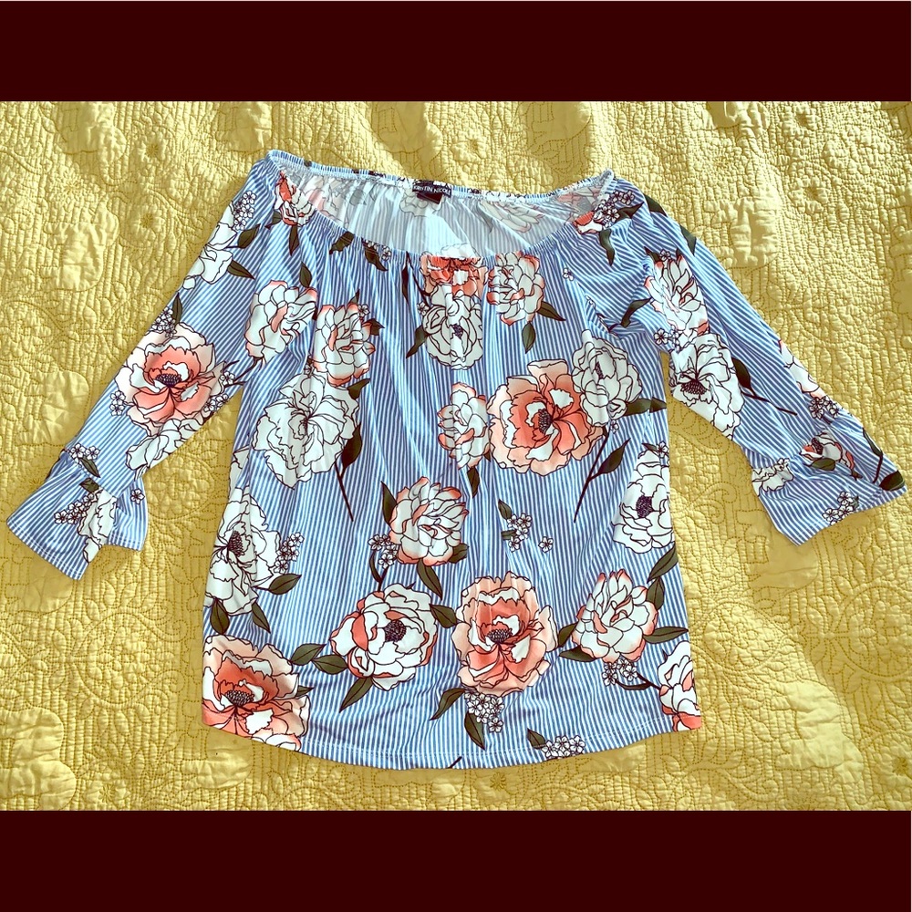 Kristin Nicole Top. Striped with flowers can be worn on or off The shoulder Bell Cuff sleeve. Soft material. The stripes and flowered pattern make this too flattering on all body types. It’s adorable and comfortable. A win win! Can be worn as a casual work too or dressed up for a night out.
