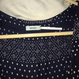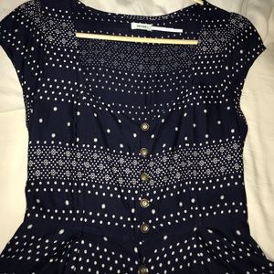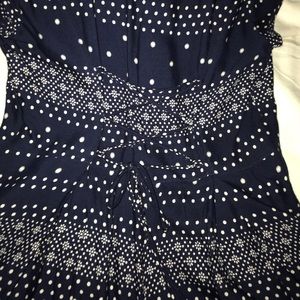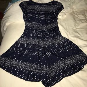 Dark navy romper with patterns. Buttons down front and tie in the back. Low neckline. Great condition.