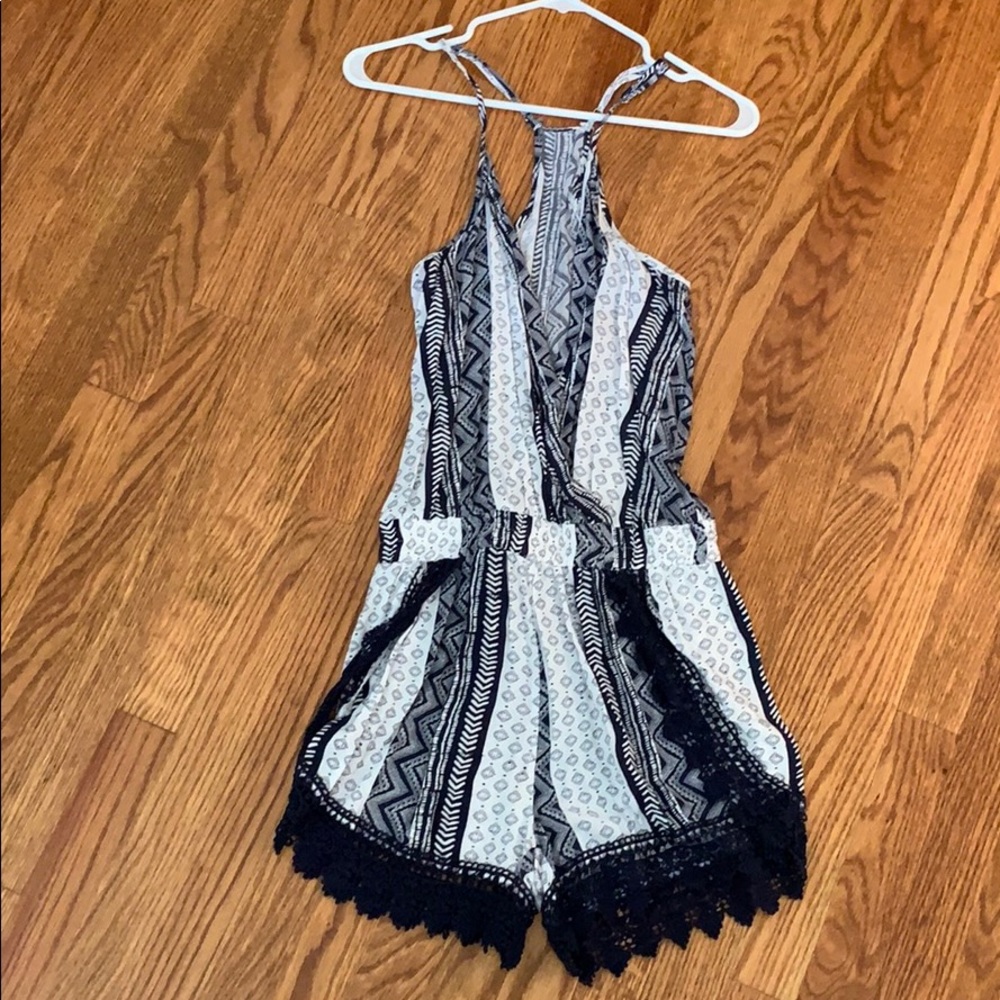 Low-cut patterned and lace romper. Adjustable straps in back from surf shop