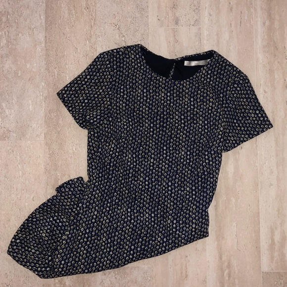 Adorable romper with a circular pattern that features a skirt in the front and shorts in the back! Open back. Thrifted in NYC, and never worn!