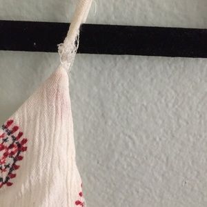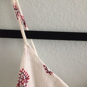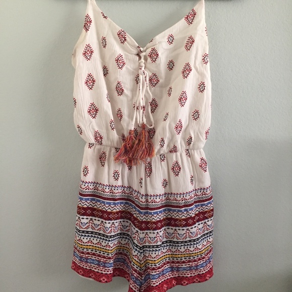 Patterned Xhiliration romper with adjustable straps and elastic waist. Super cute! It's well loved so there is fraying on both straps but has been like that for awhile. Could easily be secured with thread if you felt like it