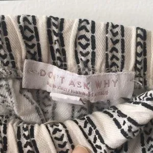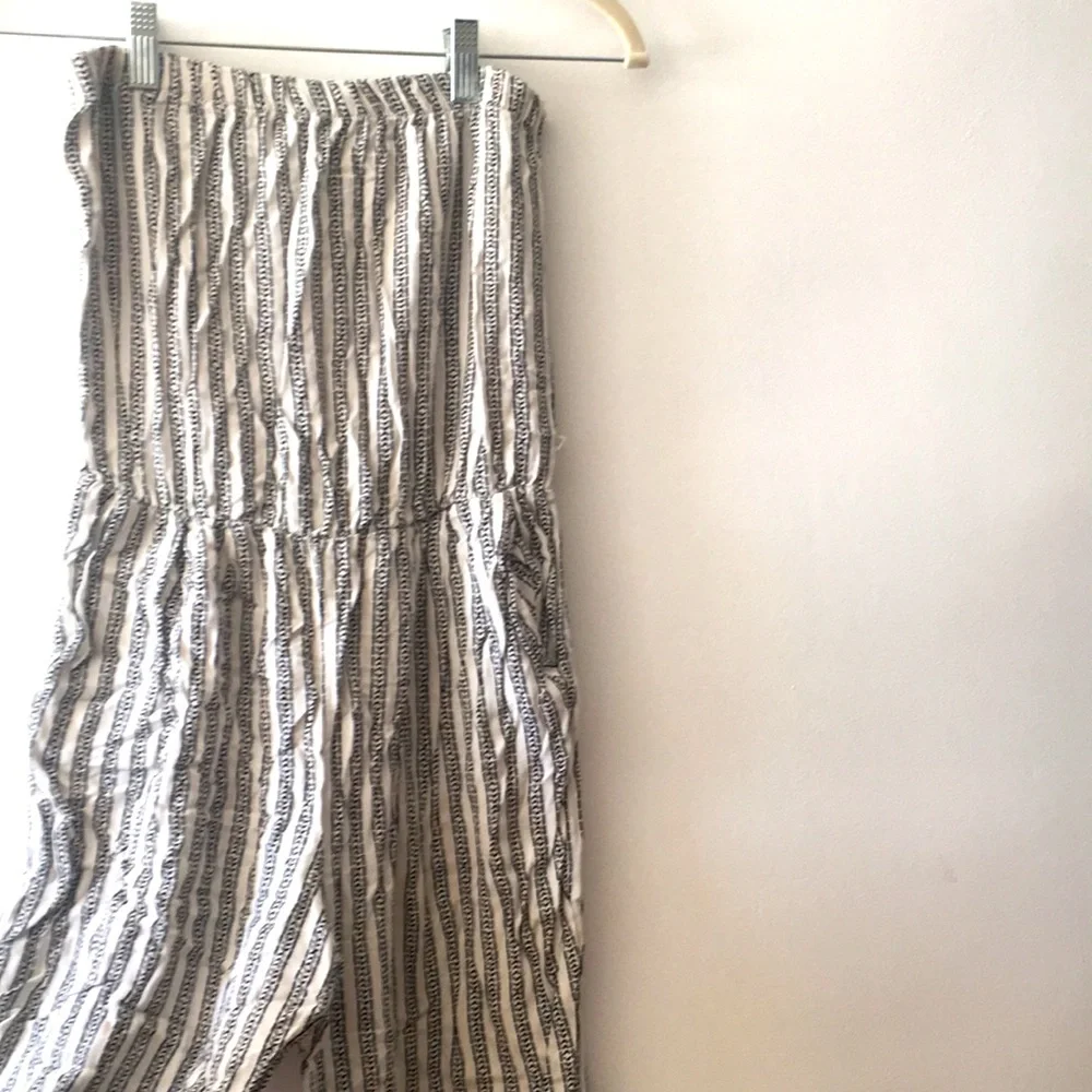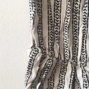 Drapey, comfy romper with cream and white pattern. Has elastic at the top and waist and pockets. Hits mid calf on me (5’4). One size, would work best on XS to M