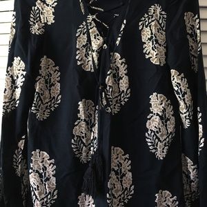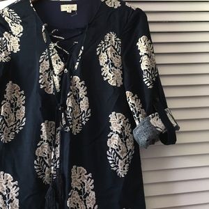 I took the tag off before trying it on. Never worn. Too small on me. Perfect condition. New without tags. Fits a 2-4. Bought it online from a boutique (cannot remember where). Can roll up the sleeves to a quarter sleeve!