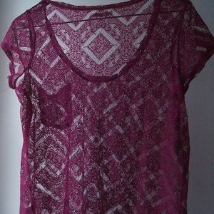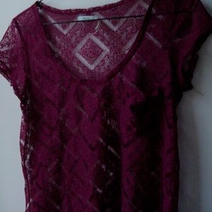 Pretty burgundy shirt. It's pretty see through so you'd probably have to wear a tank top or camisole underneath. It's barely worn and has a couple of pulled threads. I'm always open to offers and trades! Feel free to ask questions 😳