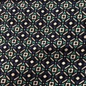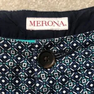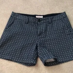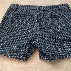 Blue, green and white diamond pattern. 5” inseam. Front slit pockets. Back pockets. Belt loops.