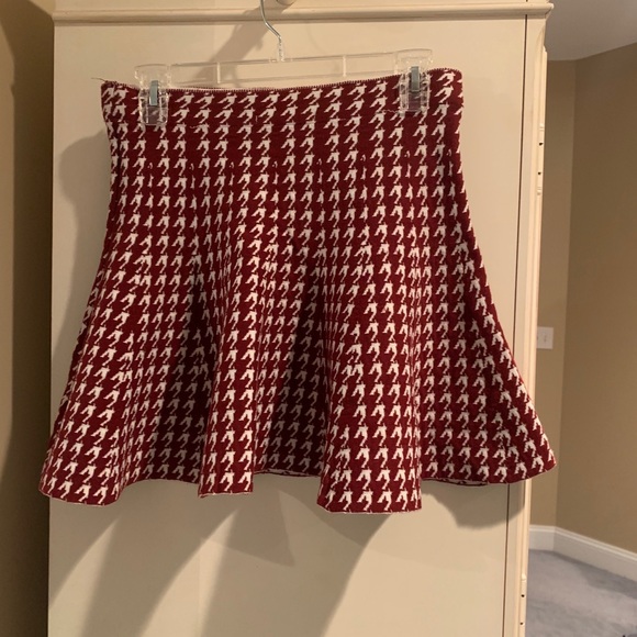 Thick warm skirt that is very high wasted. It is a size large and is from francescas. It has never been worn but feels very thick and comfortable. It is more of a dark red rust color pattern with white. Good length