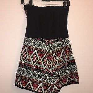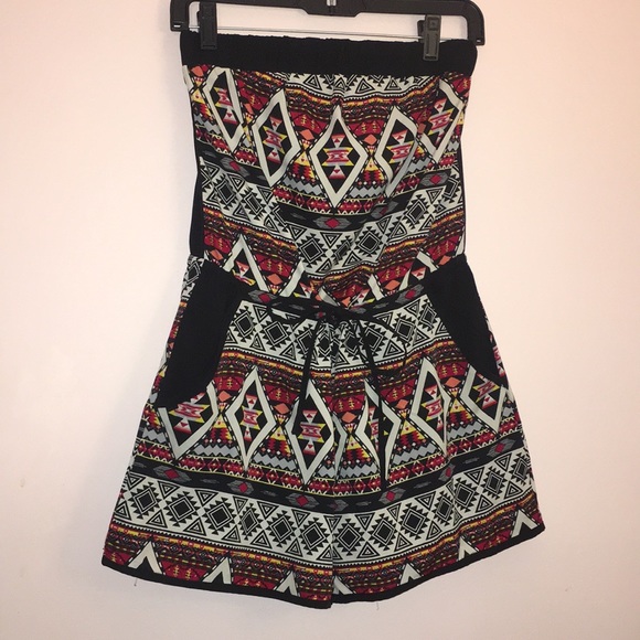 Super cute strapless patterned romper with POCKETS!! Waist has an adjustable string which can be tied.