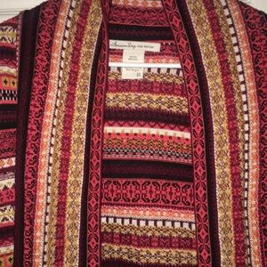 Patterned sweater with reds,oranges,yellows,blacks and browns. Perfect to wear with leggings or black skinny jeans.