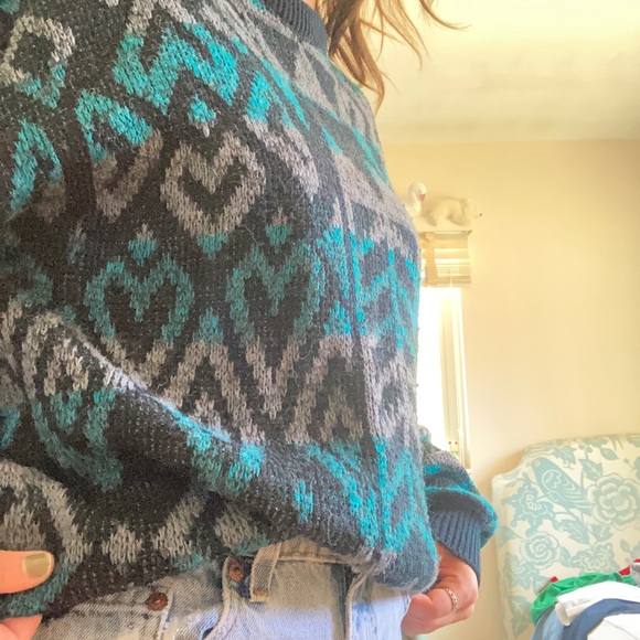 Vintage ski sweater!! Blue and grey heart/diamond pattern with a black background. Super cool for ski-bunnies. Brand is McGregor and labeled size is X-large.