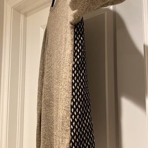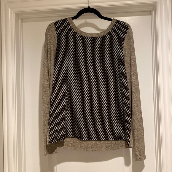 Tan and black marked sweater with contrasting patterned front. The black and tan patterned front is a silkier material (not sweater). Gives it more of a dressy feel.