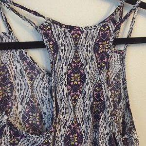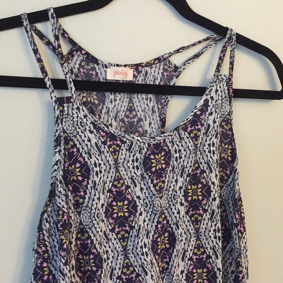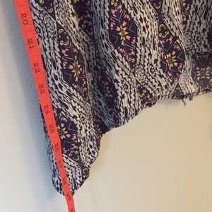 Round neck, longer on sides, fun pattern, rayon material, lightweight for summer, fringe on bottom you can cut off