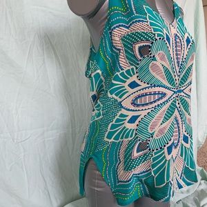 Female cut, low in the front. Very comfy, worn 4-5 times. Perfect for any summer occasion!