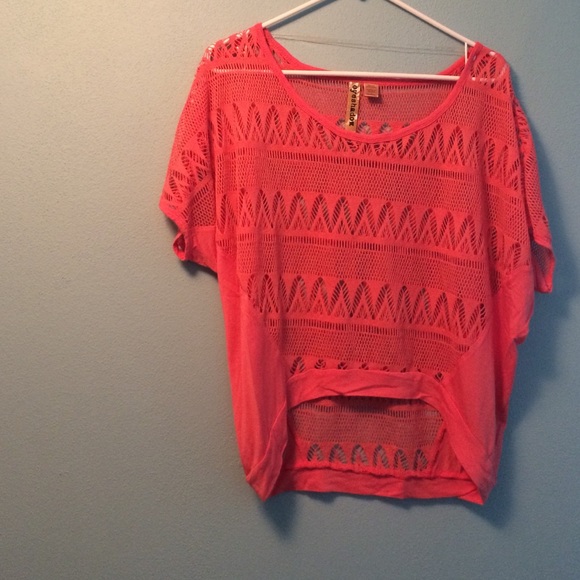 This salmon colored top has a cute pattern cut out through shirt. Clean, no damage