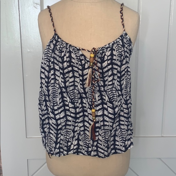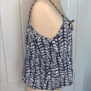 White and navy blue patterned top. Great with white shorts or jeans. From Greece so no brand. Detailed straps and tie in the front to make longer or shorter. Great condition