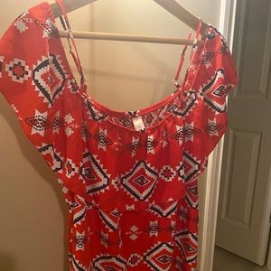 Beautiful patterned top. Wear with spaghetti straps and have sleeves off the shoulder. Runs small - closer to L or XL