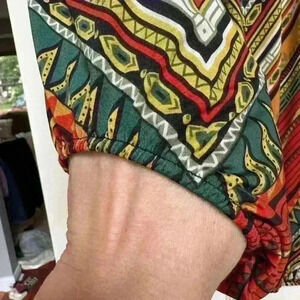 Elastic at arm and waist for flattering fit. Polyester and spandex. The size tag is not on it but I think it’s a medium. Looks great under a jean jacket for fall!