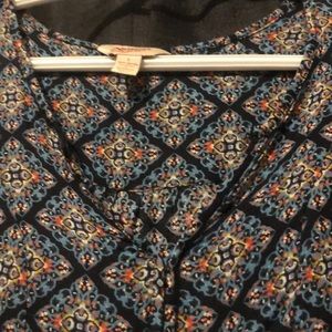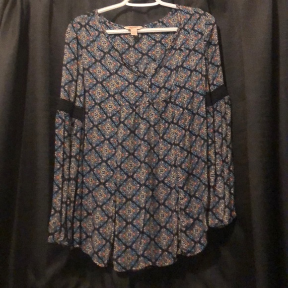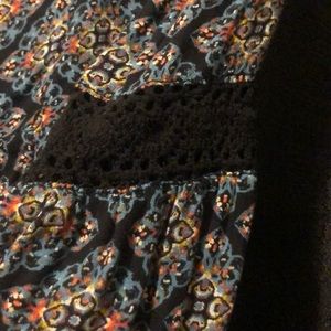 Patterned tunic with cuffed sleeves. Crocheted band around elbow area. Vneck perfect with leggings!