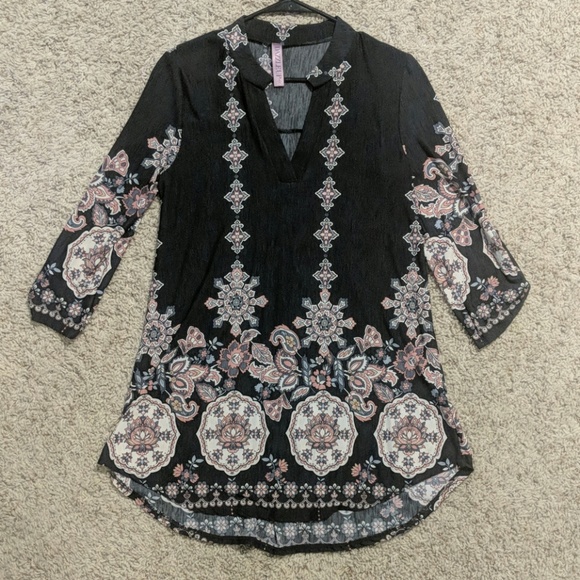 NEVER WORN. Deep navy/black long tunic with pink/white detail. Vneck, 3/4 sleeve. Curved hem.