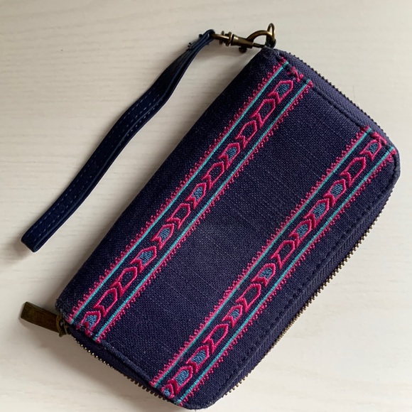 Patterned wallet with zipper closure and inside pockets and wrist strap