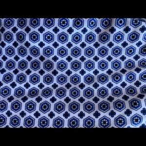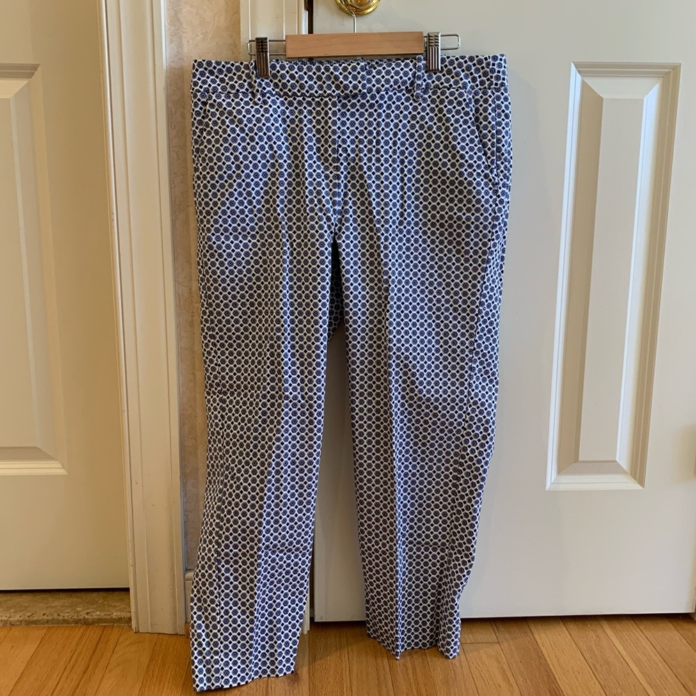 Blue and white patterned pants from Darjoni. Perfect for work, school, or anything business casual. Straight leg, low rise and ankle length. Super flattering and easy!