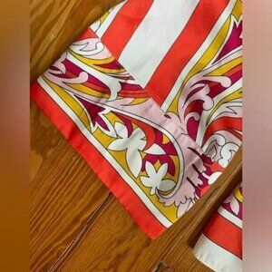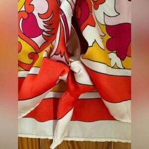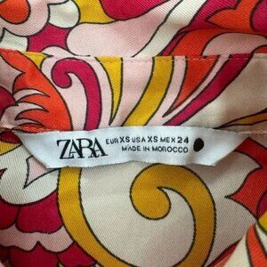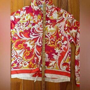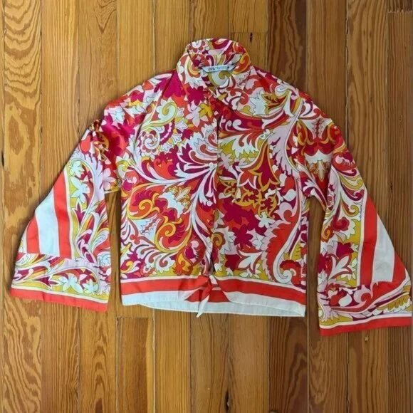 Lightly worn. Bold pattern print. Collared. Flared sleeves. Tie in front. Size XS