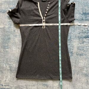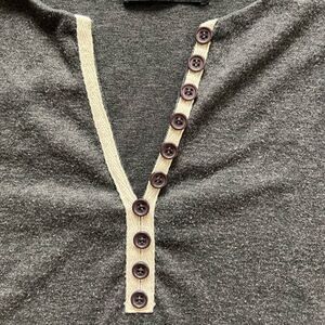 Cute gray tee with a v neckline, decorative buttons down the front, and on each short sleeve.