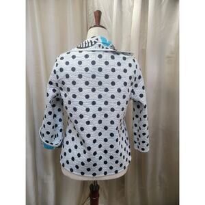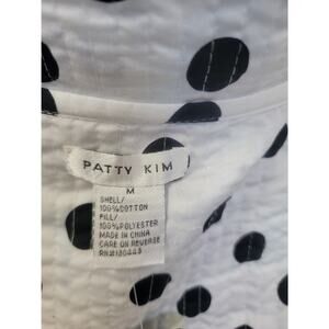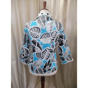 Patty Kim 100% Cotton Quilted Reversible Jacket Size Medium. NWT. Two button closure. Blue, black and white Leaf print on one side. White with black polka dot print on the other side. This jacket measures 23-1/2" long, 19" across pit to pit with 20" long sleeves. There is a 2" long slit at the bottom of each sleeve.