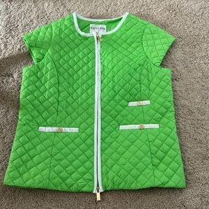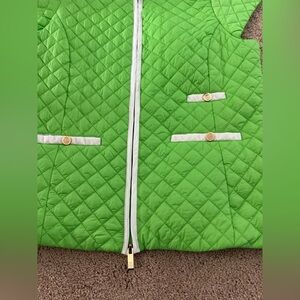 Never worn, with tags. Bright lime green quilted vest. White trim and gold hardware. Two sided zipper goes in both directions. Super soft and comfortable.