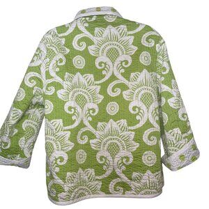 Patty Kim Quilted Jacket Size Large Green White Cotton Floral w/ Polka Dot Cuffs