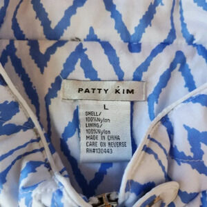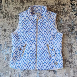 Women's Patty Kim Puffer Vest, size Large, gorgeous blue and white pattern with gold detailing, EUC.