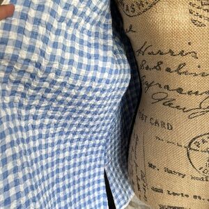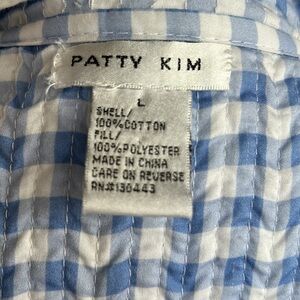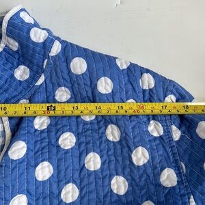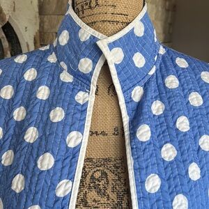 Patty Kim blue with white polka dots quilted roll sleeve side slit open front jacket. Blue and white gingham interior. Mock neck.