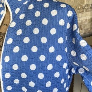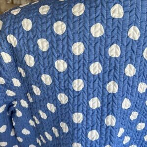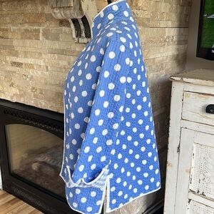 Patty Kim blue with white polka dots quilted roll sleeve open front jacket