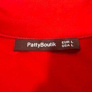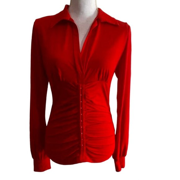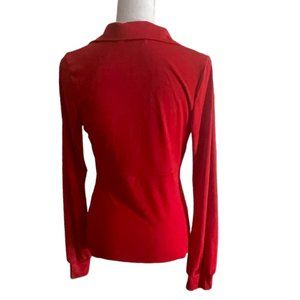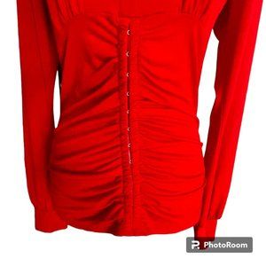 PattyBoutik Red Long Sleeves Rouched Flattering Notch Collar Top - L