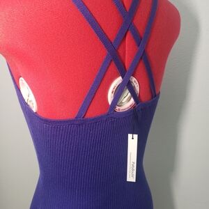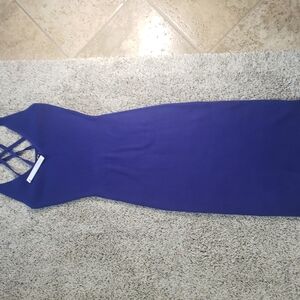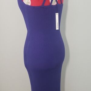 Sleek, sexy and super soft knit dress in indigo-blue with criss cross straps. The color is a stunning indigo blue, almost a violet color but more blue than purple. New with tags and never worn! Size medium and fits like medium but can also be worn by a smaller gal. Theres plenty of give in the stretch and still feels luxurious due to the thickness. This dress is mid calf length with ribbed sweater knit texture for a figure hugging and flattering fit. Ideal for a curvy gal whose not afraid to show off her beautiful figure. This gorgeous dress is the one for you to stand out in elegance. Are you going on a cruise to the carribean? This dress will look stunning with a dramatic big rimmed hat while your sitting on deck. This can be worn with flirty sandals during the daytime, then slip into a pair of sexy pumps and pair with a silk blouse tied at the waist for your evening look. Any jewelry would look great with this dress as well!