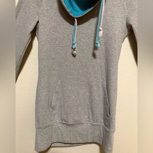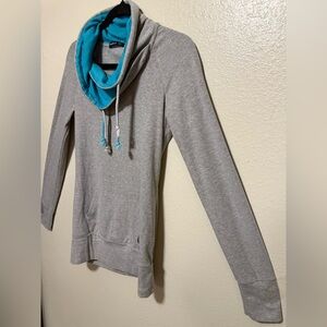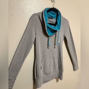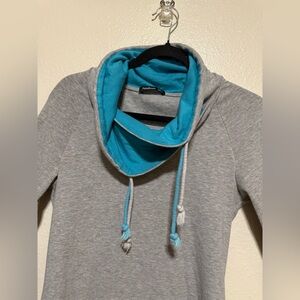 Stylish gray hoodie featuring a cozy cowl neck with blue lining. Perfect for casual wear.