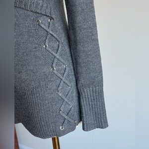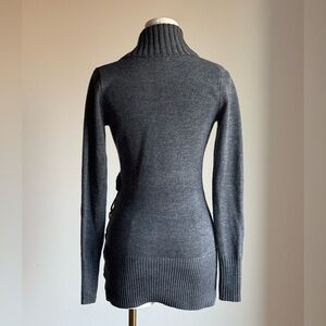Great looking long Cawl neck long sleeve sweater hugs the body, laced details on the side, only worn once, I personally dont like the snug feeling in a sweater. Size small in heather gray.