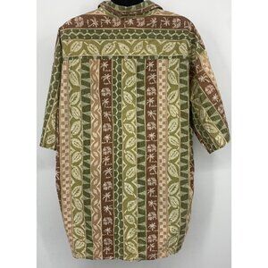 This is a men’s button up shirt by Pau Hana. This shirt has short sleeves and a collar. This shirt is multicolored, combining red, green and tan in a Hawaiian pattern. This item is in excellent pre-owned condition.