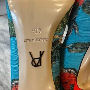 Elegant floral heels by Paul Andrew. Features vibrant blue and red design. Perfect for adding a pop of color.
