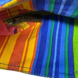 This spacious canvas beach tote features a vibrant flip-flop design and a colorful striped interior. Equipped with durable handles and zippered pockets for convenience.
