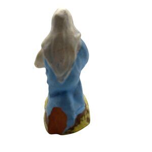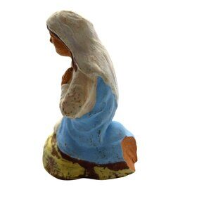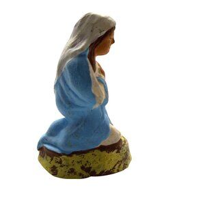 This hand-painted figurine portrays the Virgin Mary in a humble kneeling position, ideal for nativity scenes or as a collectible religious item.