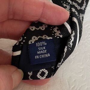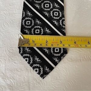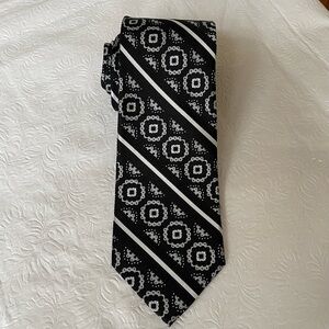 Paul Frederick 100% silk necktie. Stripe design in tones of black, white, and a shimmery silver. Paul Frederick’s regular size of approx. 57”- 58”, see last photo for sizing description. Very well cared for, gentle use condition! Recently dry cleaned.