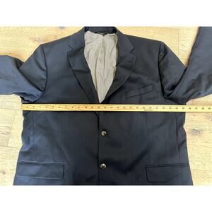 Paul Frederick 100% Wool (lining is 100% polyester) Sport Coat Size 48R in Color Navy. Good preowned condition, no holes, stains or defects noticed. In the photographs, the color of coat is not showing well in first photo (hanging) and the color is more accurate in the measurement photos. First 4 photos are stock photos.