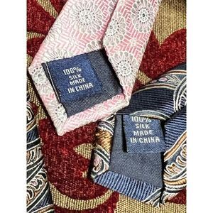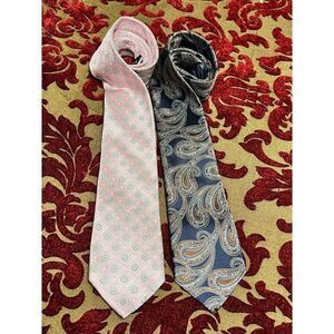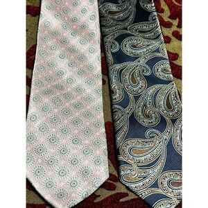 Both still in fabulous condition. Darker one is a navy blue with brown paisley design and measures 61” from tip to tip, pink is a light pink with gray floral design and measures 63” from tip to tip both are 3.25” wide.