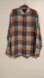 Stylish plaid shirt with blue and orange tones. Perfect for casual outings. Comfortable and trendy.
