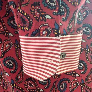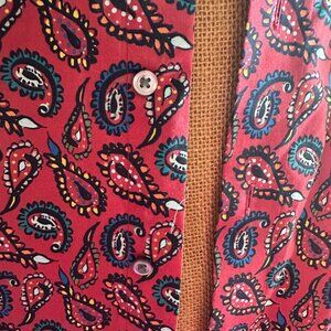 Color: Red with multicolor paisley, striped accents inside collar & cuffs