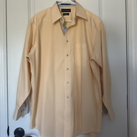 Elegant Paul Fredrick shirt with yellow and white stripes. Made from non-iron 2-ply cotton for easy care. Classic fit high quality shirt.